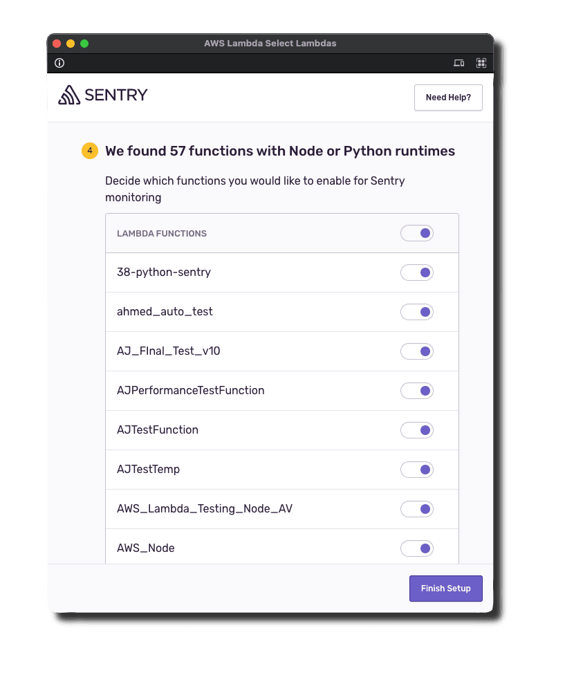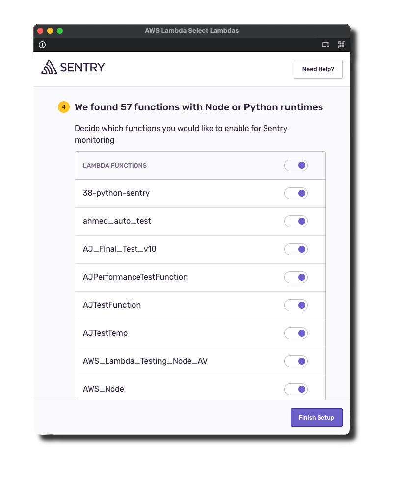 1. Select the Lambda functions to automatically add the Sentry layer and necessary environment variables when you Finish Setup. Note: You can enable or disable Sentry on Lambda functions after installation.