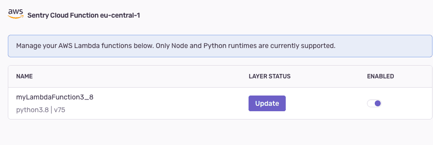 The integration configuration view in Sentry allows you to do the following with your Lambda functions: