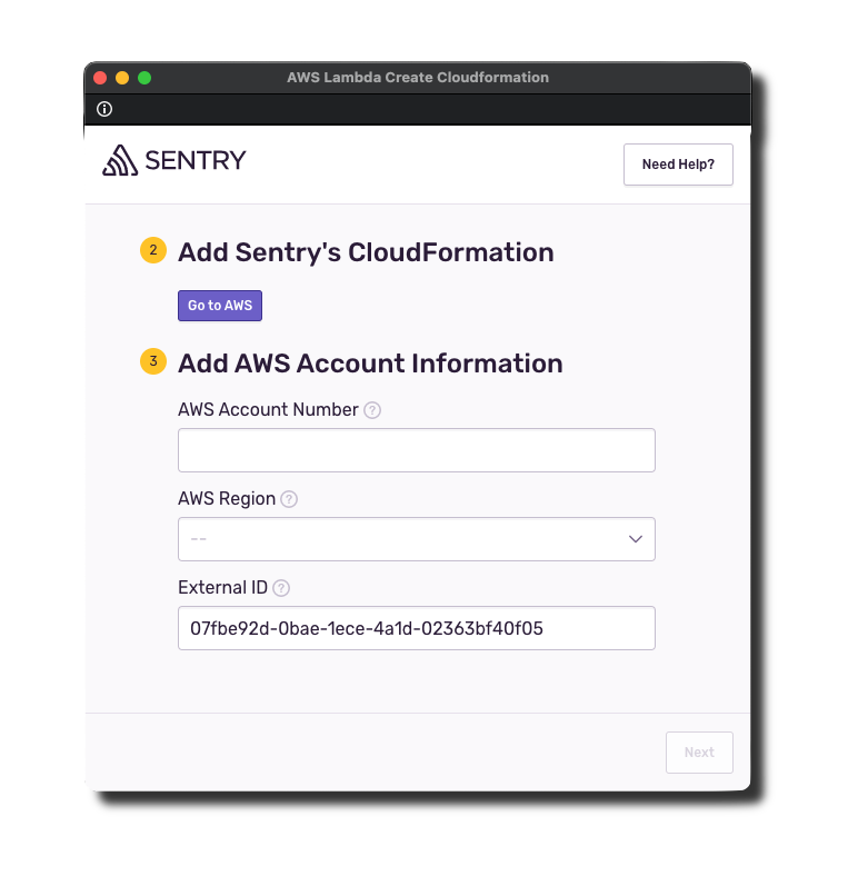 • Sentry is unable to access your AWS account through your CloudFormation stack. This means either the stack has not been created or the external ID used doesn't match the one in your installation. You can go to the Parameters tab of the CloudFormation stack to copy the value of the external ID and paste it into the form field.