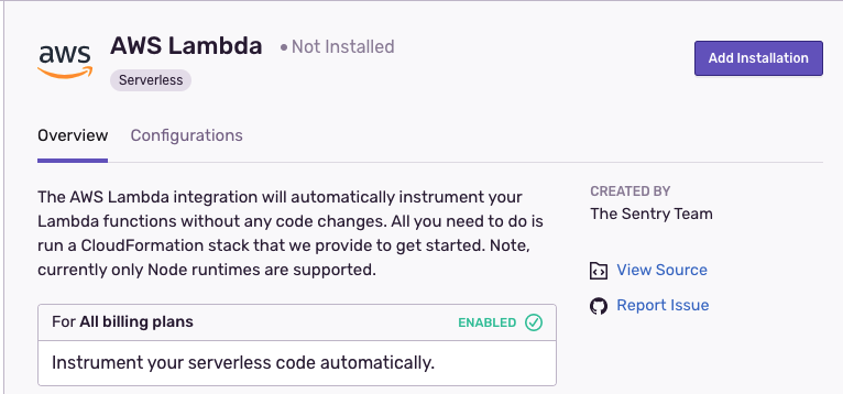 Note that when the integration is uninstalled, your Lambda functions will still be instrumented with Sentry and you will continue to receive errors. If you want to disable Sentry for all your Lambda functions, you should disable Sentry for each function before uninstalling. Note, you can also uninstall and then reinstall if you would like to change the Sentry project for your Lambdas.