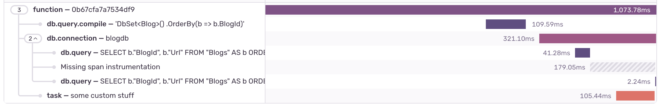 where an unrelated task would attempt to be nested within the db.connection span. Since the task does not have db.connection set as parent it gets appended at the bottom. But because it happened while the connection was open it would get interpreted as a missing instrumentation.
