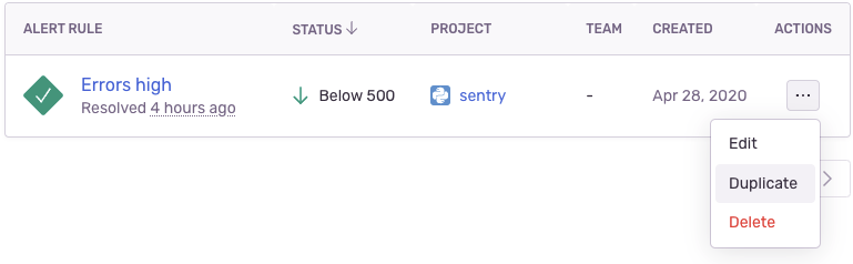 You can also create an alert by duplicating an existing issue or metric alert rule. To do so, navigate to Alerts and click "Duplicate" in the context menu (under "Actions") on the row with the alert rule you want to copy: